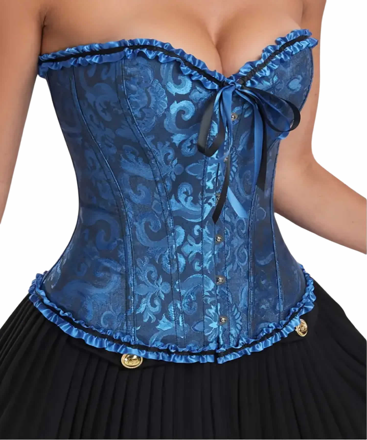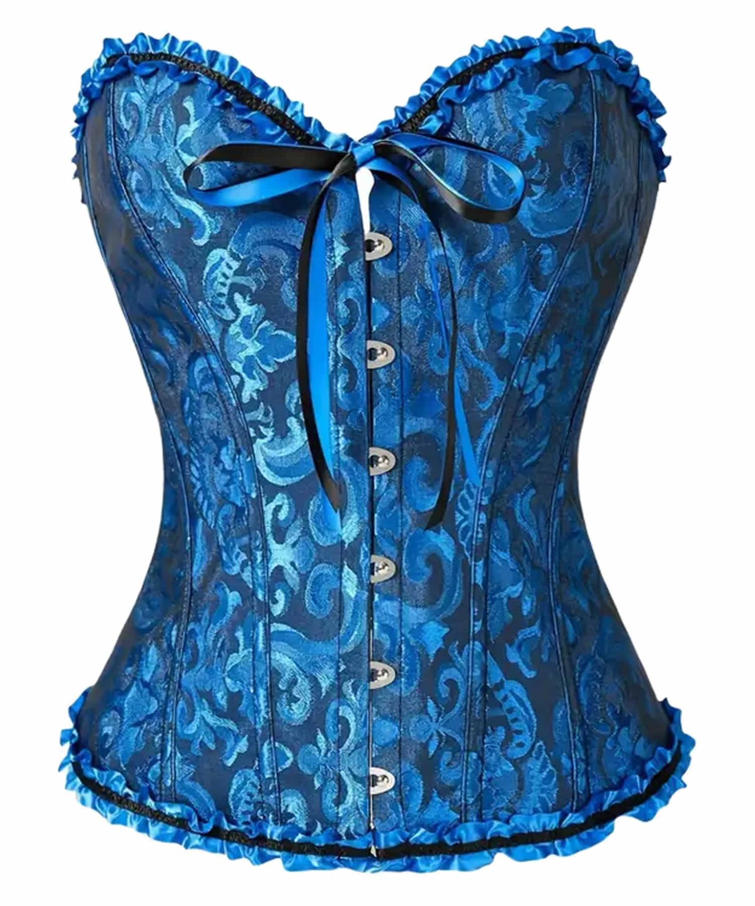 Descubre el equilibrio perfecto entre sofisticación y romanticismo con nuestro Corset Victoriano Azul, diseñado en exquisito jacquard floral. Su escote corazón con delicado volante, cierre frontal con botones metálicos y ajuste posterior con lazos crean una silueta de ensueño para cualquier ocasión especial.